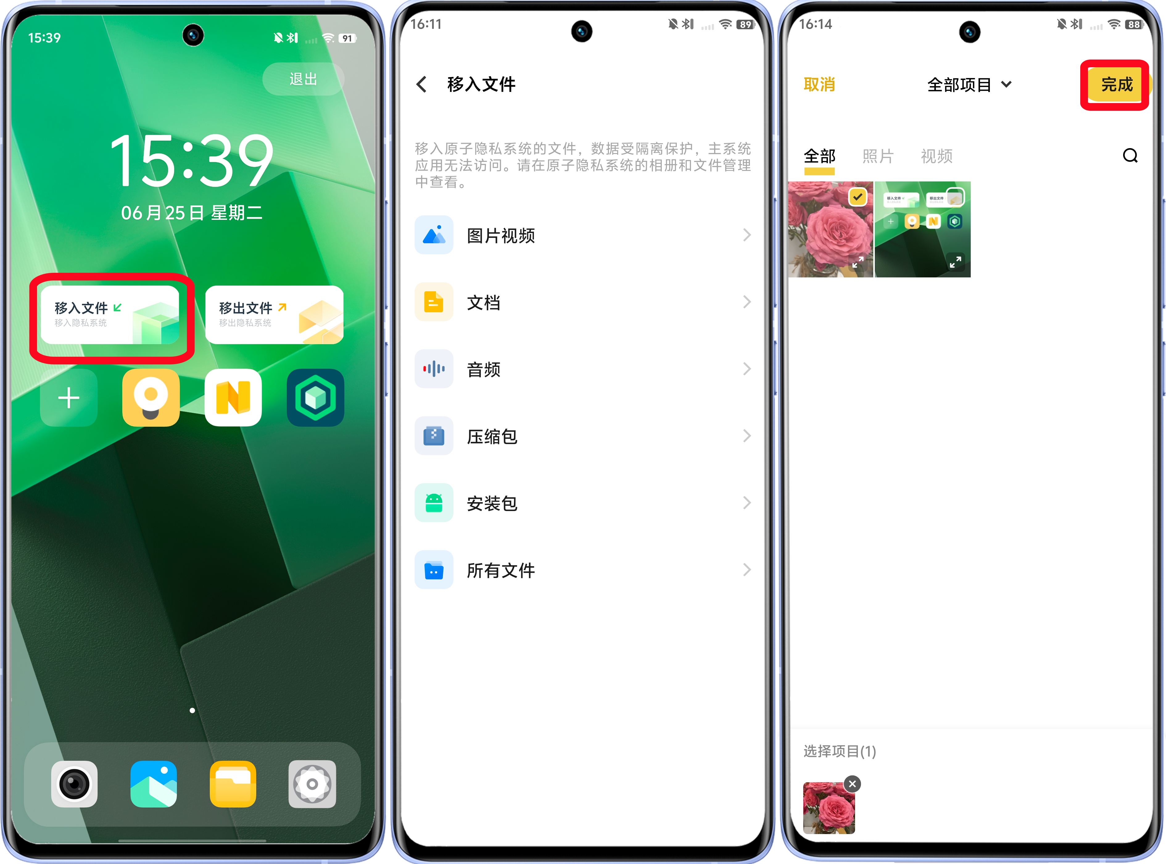 方法一、进入原子隐私系统 > 点击桌面移入文件组件 > 选择需移入的文件 > 勾选文件后点击”完成“即可;