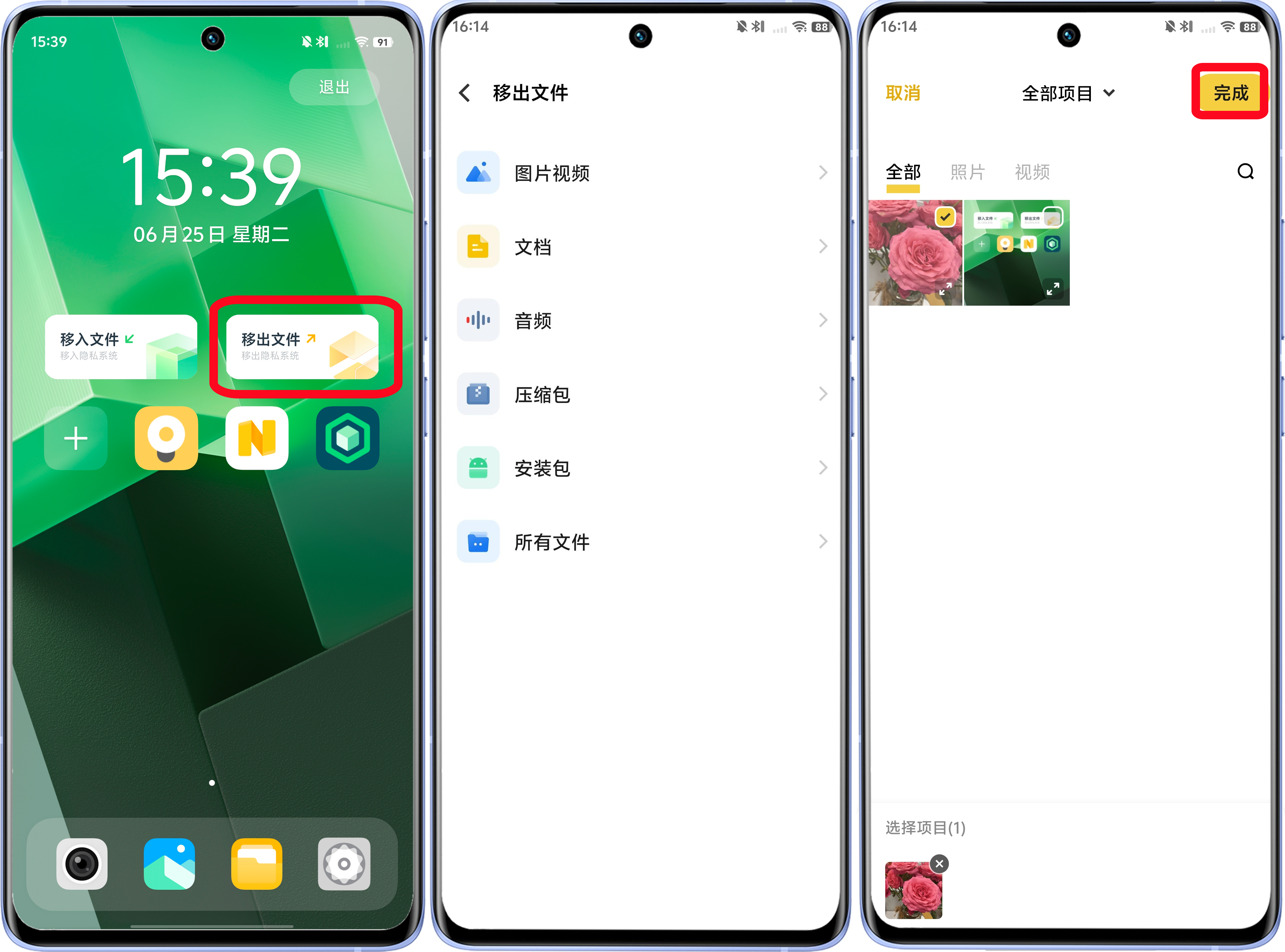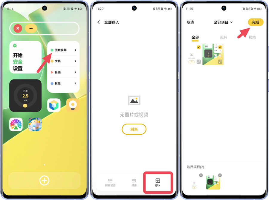 - 移入文件,如:照片、视频、文档、其他(音频、压缩包、安装包)