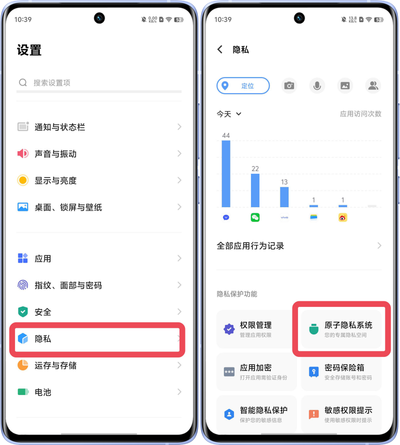 其他应用入口/其他模块入口:可在文件管理、相册、手机管家(原i管家)、视频(原i视频)、使用技巧、蓝心小V/Jovi语音、近期任务等入口进入原子隐私系统